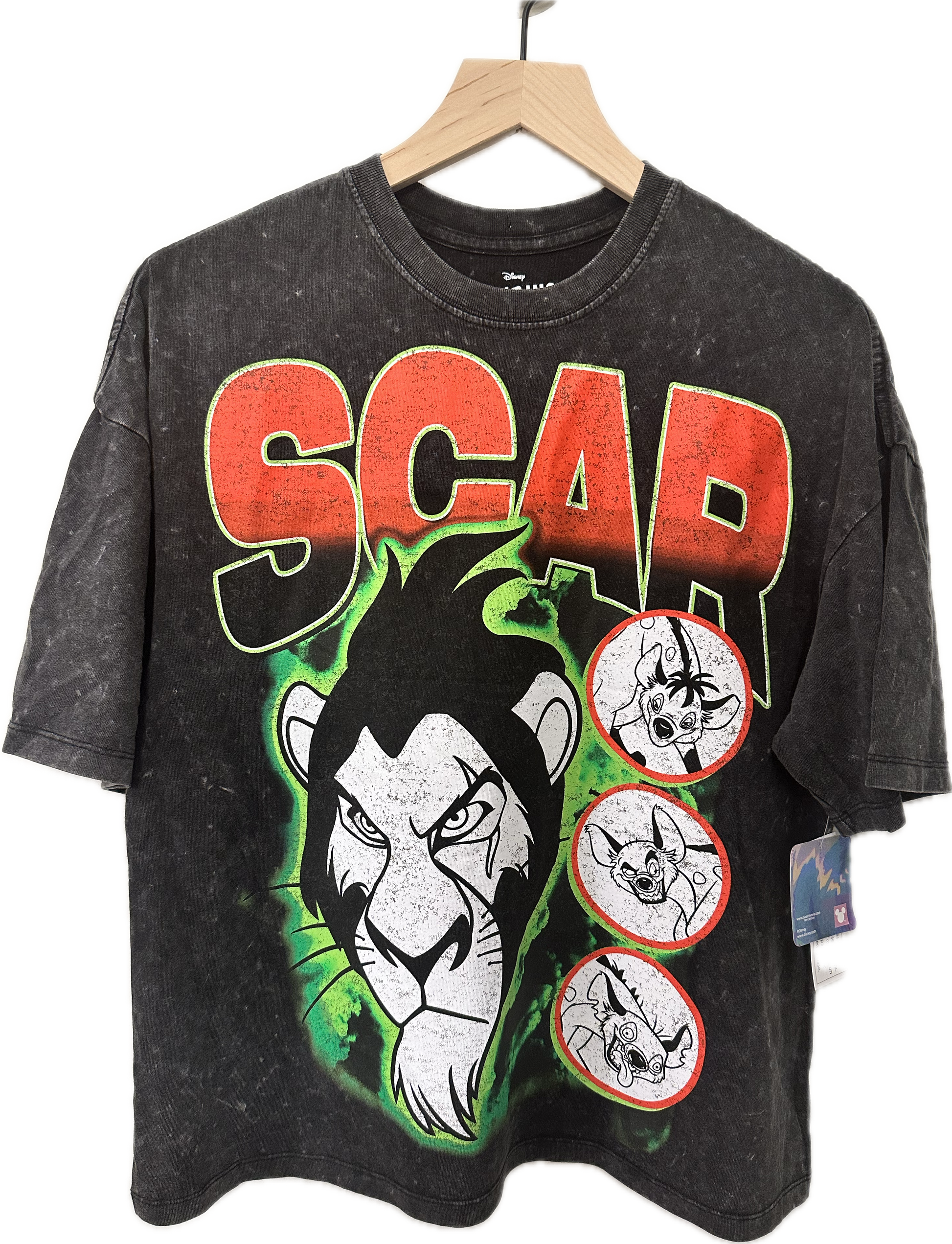 Experience the dark side of Disney with our Scar from Lion King cropped t-shirt. Featuring the infamous villain and his loyal hyena companions, this shirt is perfect for fans of the classic film. Show off your love for the iconic characters while staying on trend with this cropped style.